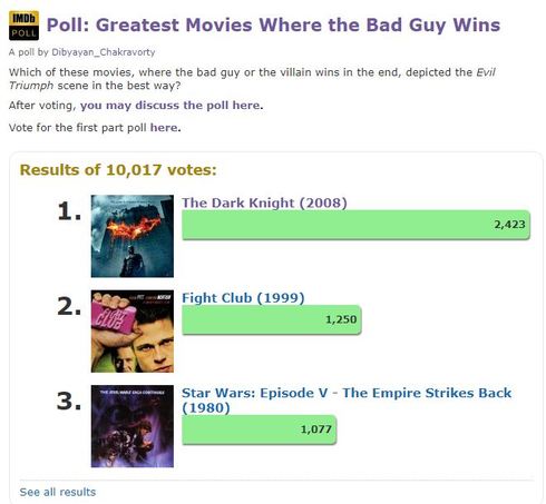 03 November 2017: Greatest Movies Where the Bad Guy Wins - http://www.imdb.com/poll/n9NnoVMlxsY/ (A poll by Dibyayan_Chakravorty)