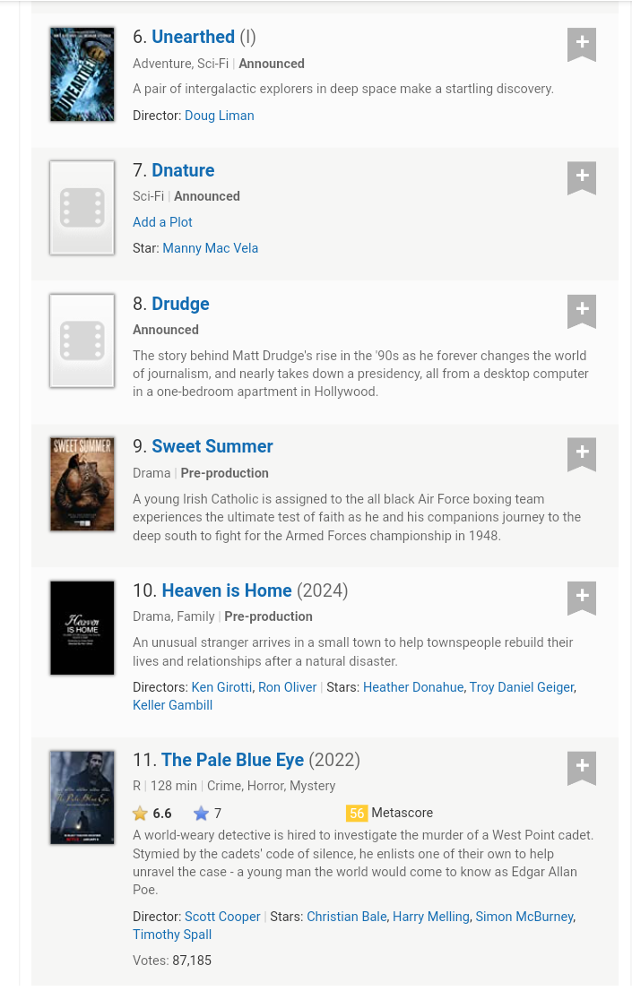 FYC, Cross Creeks latest movie, The Pale Blue Eye (2022) should be added. Plus, you may want to consider adding The Vanishing (2018), a Cross Creek co-production. It has more votes than some other listed Cross Creek co-productions already listed. Plus, it is currently streaming on Netflix, so I imagine it will break the IMDb 25k vote threshold soon.